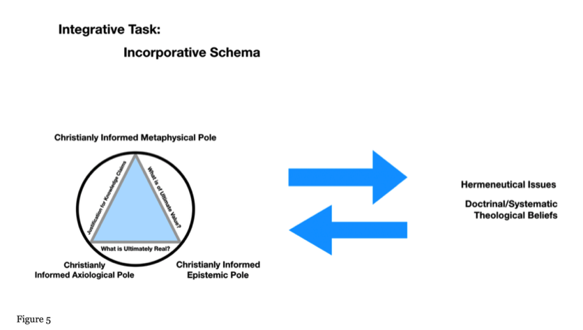 At the bottom right of Figure 4 (above) you will see a highlighted list of integrative tasks that are next steps to further explaining "thinking Christianly." We do not mean, as you will see, that you wait until you finish organizing your views in the academic domains before you do theology, rather that both aspects are done concurrently. Through iterations of development, we are looking to construct a sophisticated understanding of the three pole areas, informed by hermeneutical and doctrinal issues that come from our theology. See Figure 5 below: