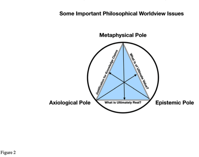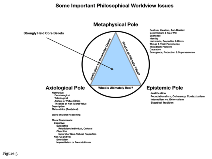 Through the centuries philosophers have focused on three plausible areas of noetic organization: epistemology, metaphysics and axiology. Each has technical meanings and domains, but for our purposes let’s think of the contours of epistemology as having to do with justification given for claims of knowing and knowledge. The domain of metaphysics is much broader, but let’s say for our purposes it has to do with what is real and what really exists. Axiology is the name we are using for the category of our values and ethics. Our beliefs in these three areas can tell us a great deal about how one thinks about a myriad of life orienting issues.