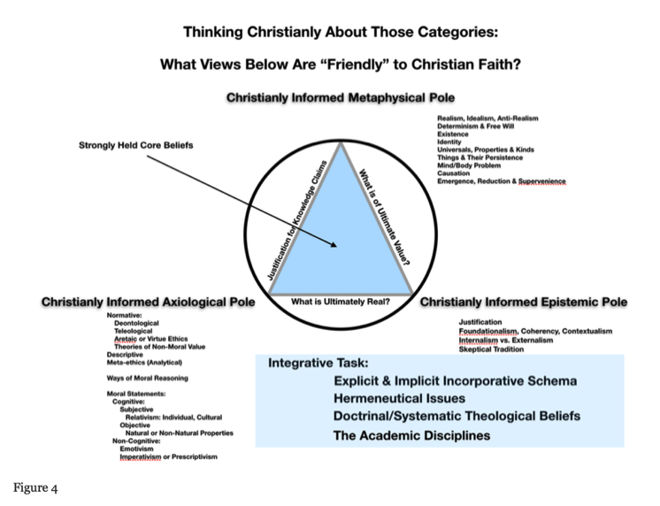 4 I want to acknowledge that the basic idea in the first sketch and its subsequent use in the article came from a class I took in seminary taught by Chuck Moore—about thirty years ago. That is, from him I got the basic idea of sketching the areas we are discussing within a circle and explaining their meanings on the sides of an inscribed triangle. I liked it because it could provide an useful way to partially visualize what clarifying a “thinking Christianly” worldview project looks like. However, what I am developing from there to visualize how the sub-categories can be analyzed and interact with Christian theology and the academic discplines are mine, including my being responsible for any errors.