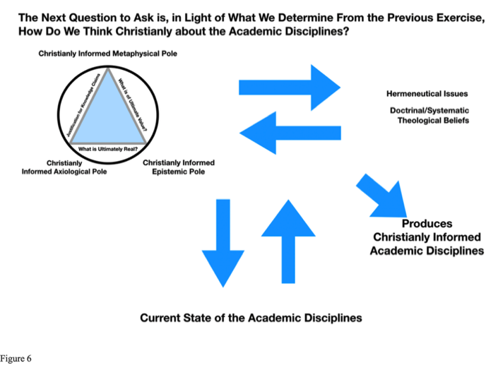 There is one more figure (below) we wish to highlight in this article. We hope it can help you visualize how the process of thinking Christianly about three important domains of thought can clarify your own worldview and through the interaction produce a Christianly informed view of the academic disciplines.